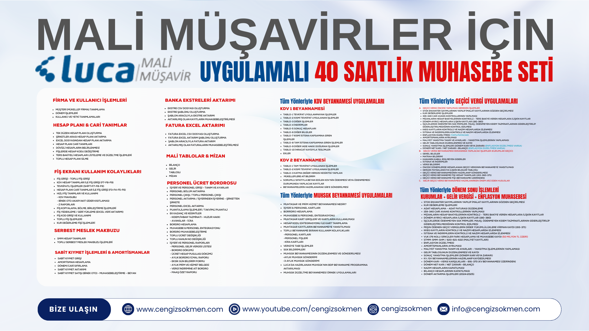 Luca Mali Müşavir Uygulamalı 40 Saatlik Eğitim Seti, muhasebe mesleğinde sağlam bir altyapı oluşturmak ve uygulama süreçlerinde tam hâkimiyet sağlamak isteyen profesyoneller için hazırlanmış kapsamlı bir eğitim programıdır.