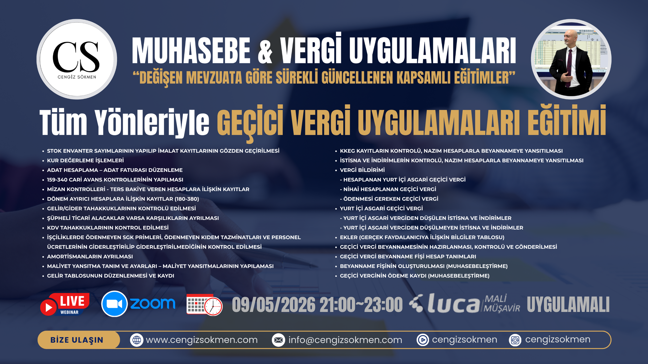 Tüm Yönleriyle Geçici Vergi Uygulamaları Eğitimi 09 Mayıs 2026 tarihinde Zoom üzerinden canlı-interaktif olarak yapılacaktır